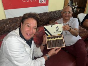 Acompañado por los comunicadores Michael Holguín, Juan Alberto Peña “El Príncipe” y Brenda Sánchez, el actor y cantante saboreó los exquisitos cigarros de la casa, mientras se dejaba envolver por los tragos exóticos que danzan en las copas como versos de una canción.